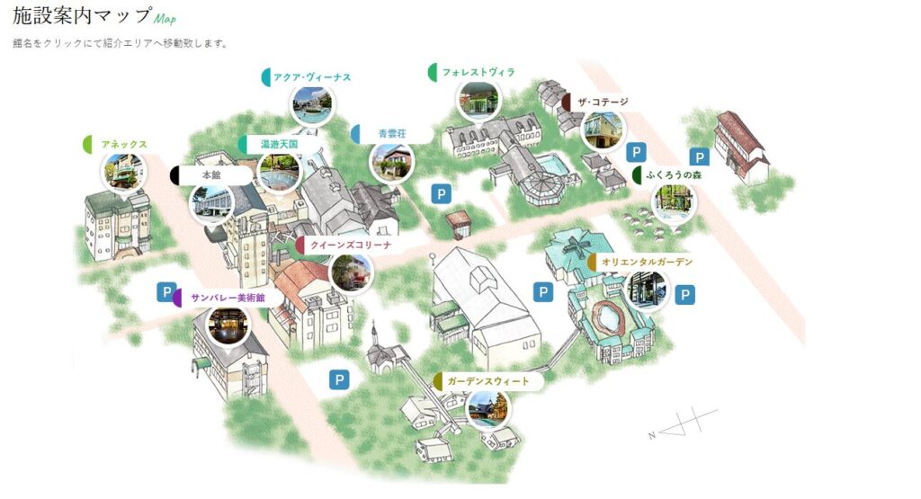 サンバレー那須は、広大な敷地に趣の異なる9つの宿泊館が点在しているのが特徴です。